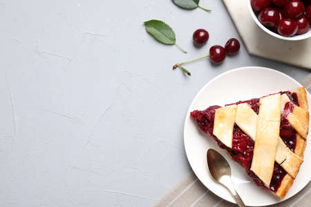 Delicious fresh cherry pie served on light gray table, flat lay. Space for text