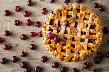 Cherry pie with fresh cherries on a rustic wooden table