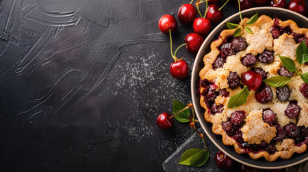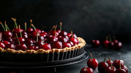 A delicious cherry tart is displayed on a dark surface, topped with vibrant, fresh cherries. The tart features a golden crust and is surrounded by scattered cherries.