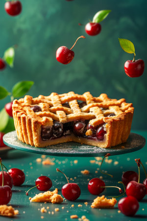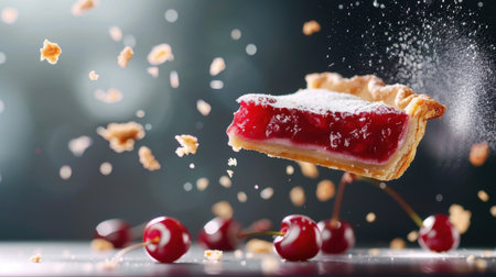 A captivating image of a floating slice of cherry pie, sprinkled with sugar dust, surrounded by scattered crumbs, captures the essence of dessert delight.