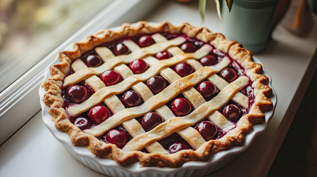 A fresh cherry pie cooling on a windowsill, the lattice crust perfectly golden with whole red cherries peeking through.
