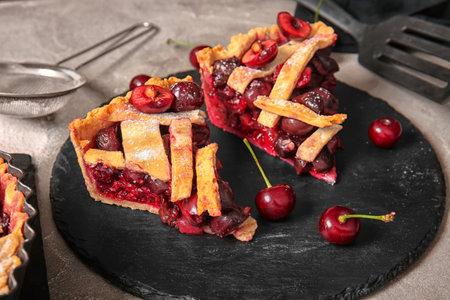 Board with pieces of tasty cherry pie on gray background