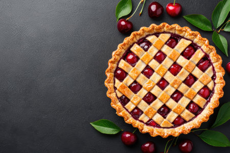 A cherry pie with a woven top crust is presented on a dark stone surface, accompanied by loose cherries and a leaf decoration