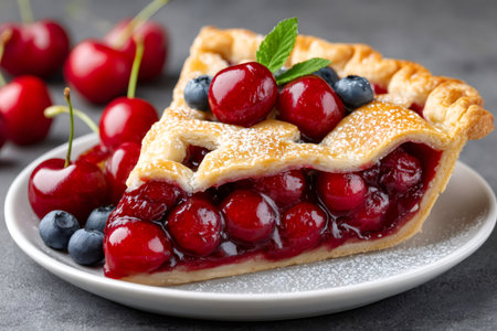Cherry pie slice topped with fresh berries and powdered sugar on a white plate