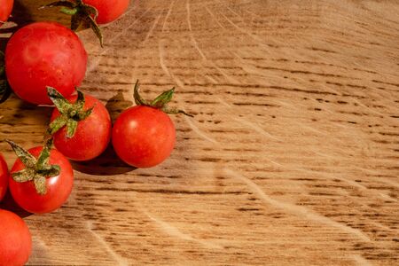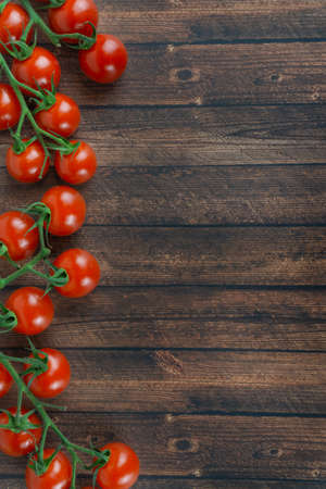 Cherry tomatoes on a branch lie on a wooden rustic brown background. Place for text. horizontal orientation