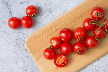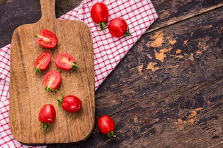 Ingredients Cherry tomatoes on a cutting board wood background
