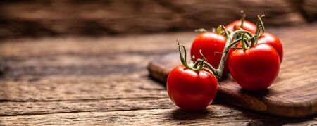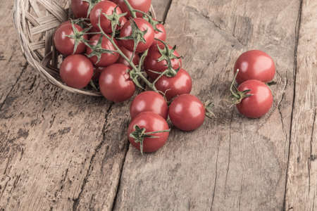 Traditional small fresh tomato fruit on wood background organic food