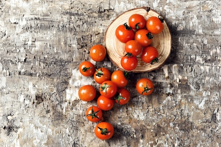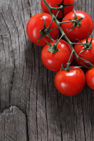 Fresh cherry tomatoes on old wooden background