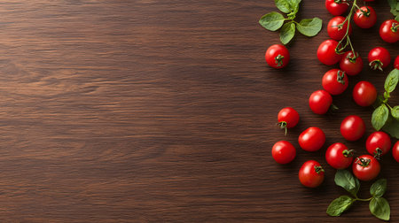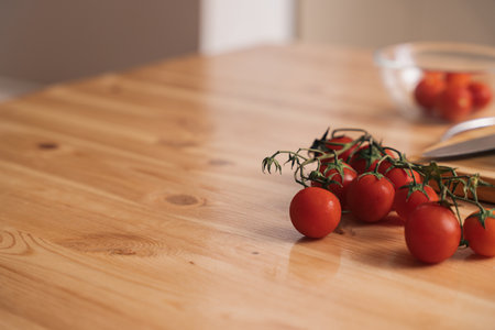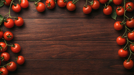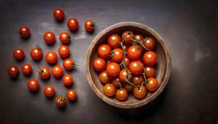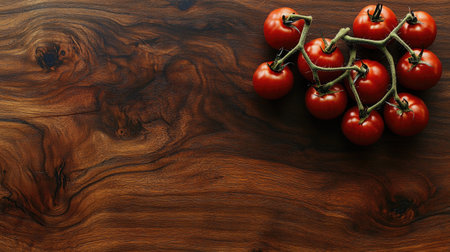 fresh cherry tomatoes spill on walnut table