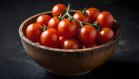 A close-up of fresh cherry tomatoes arranged in a wooden bowl, showcasing their vibrant colors.