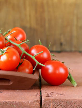 Fresh organic traditional small tomato with green vine on wood background
