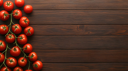 Fresh, vibrant tomatoes still on the vine are artfully arranged on a rustic dark wood surface.