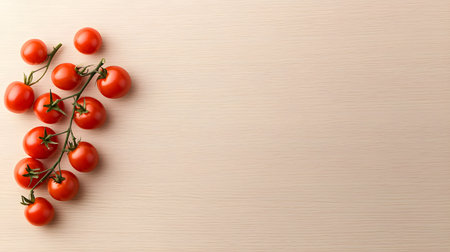 Fresh cherry tomatoes on a branch isolated on a white background with copy space, flat lay