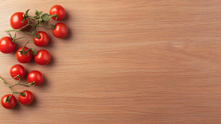 A cluster of plump, vineripened cherry tomatoes rests on a lightcolored wooden surface, bathed in soft, natural light.
