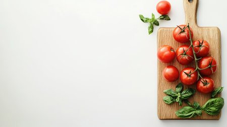 A beautiful arrangement of fresh tomatoes and basil on a wooden board, perfect for a gourmet Caprese salad presentation. Ideal for culinary inspiration.