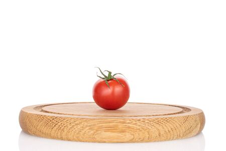 One whole fresh red cherry tomato on wooden plate isolated on white