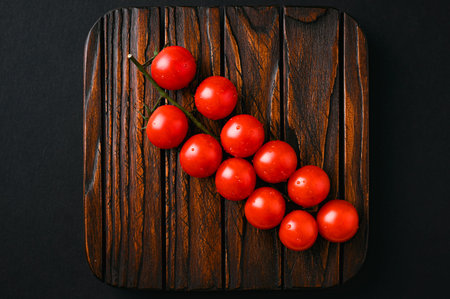 Tomato branch on dark vintage wooden plank background