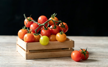 AI Generated. Fresh cherry tomatoes arranged neatly in a brown cardboard box on a dark wood surface
