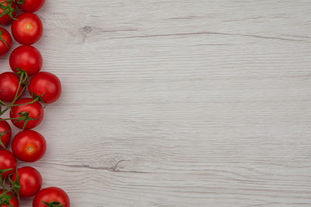 Cherry tomatoes on a white wooden background. Top view. Free space for your text.
