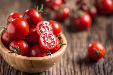 Group tomato in a wood bowl place on the wooden table. Cherry tomatoes is a small that has a sweet, firm texture and has a pleasant aroma. And contains beta-carotene, vitamin C and high vitamin E.