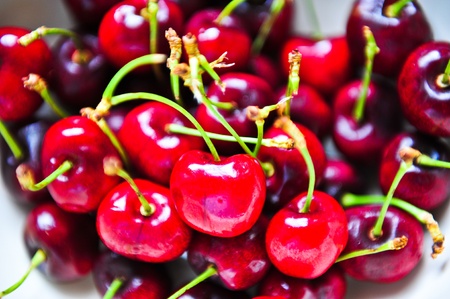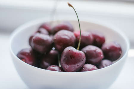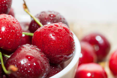 Photographed close-up ripe red cherries covered with drops of water, little depth of field, berries are on a wooden table in a white bowl