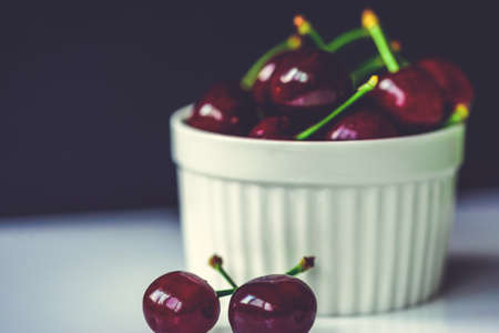 Ripe cherries close-up on a dark background. Selective focus. Good morning concept Rustic authenticity concept, vintage style.