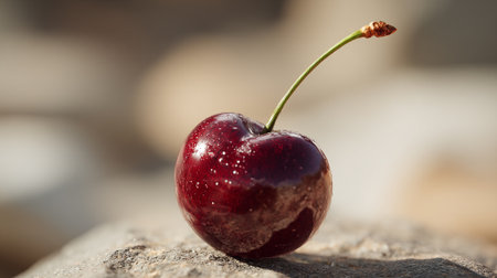 A single ripe cherry with stem, glistening on a textured surface with soft lighting.