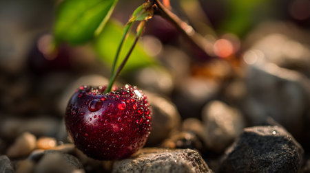 Dew Kissed Cherry Resting on the Rocks: A Moment of Summertime Bliss