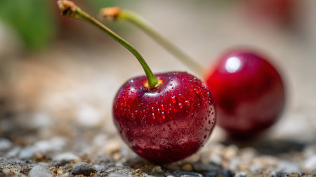 Ripe Red Cherry with Fresh Dew Drops Sits on Gritty Surface