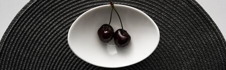 panoramic shot of fresh, sweet, red and ripe cherries with water drops on bowl