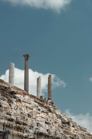 Couple sitting on the top of Ruins in Tyre. People Resting after Excursion along Necropolis in Lebanon. Visiting Famous Place. World Heritage. Active Summer Vacation.