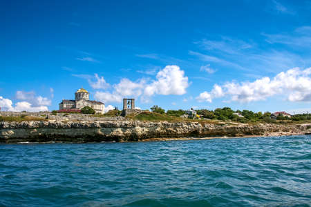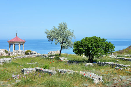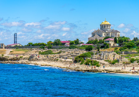 Sevastopol, Crimea, Russia - July 26, 2019: Black Sea coast with the ruins of the ancient city of Tauric Chersonesos in Sevastopol, Crimea