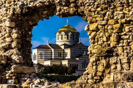 Cathedral of Saint Vladimir in Chersonesos. Russian Orthodox Church, Sevastopol, Crimea (Tauric). Christian temple View through a hole in an ancient wall. World tourism, attractions.