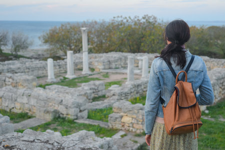 A young tourist stands against the backdrop of the ruins of ancient Chersonesus in Sevastopol in Crimea.
