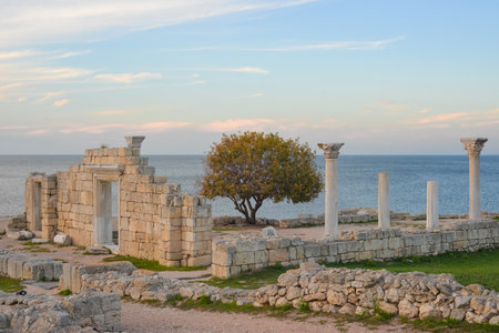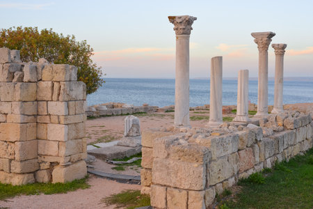 View of the ruins of Ancient Chersonesos at sunset, picturesque landscape, Crimea, Russia