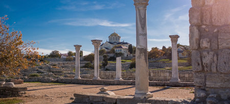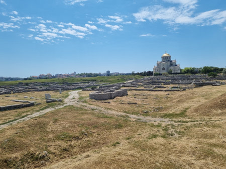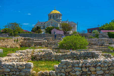 Sevastopol, Crimea, Russia - July 26, 2019: View of the ruins of the basilica and Vladimir Cathedral in Tauric Chersonesos, Sevastopol, Crimea