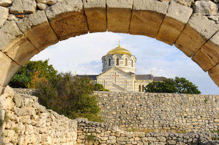 Arch in ancient wall of Creek colony Chersonesos with the view of Saint Vladimir cathedral, Sevastopol, Crimea