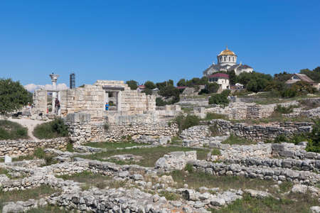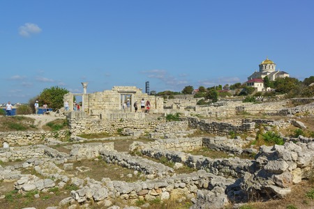Russia, Crimea, Sevastopol - September 04.2017: Tourists visiting the excavation site of the ancient Greek city of Chersonese on the Black sea. To the right rise the dome of the Vladimir Cathedral