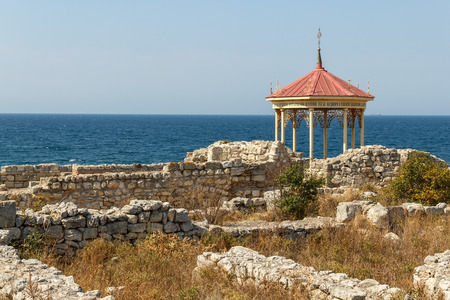 Landscape with a yellow gazebo on the background of the ruins of Chersonesos in Sevastopol