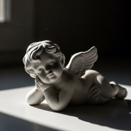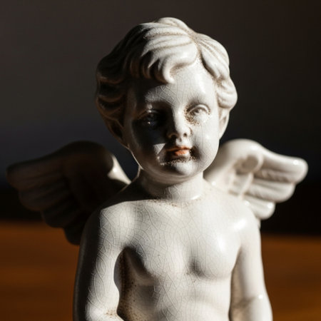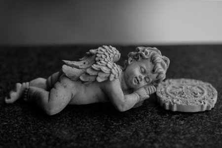 Old plaster cupid statue covered in spiderweb. Concept of faded love, loneliness, and abandonment. Antivalentin Day imagery.