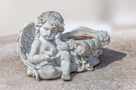 Miniature angel sitting next to the water tank for the birds, decoration on the old catholic cemetery.