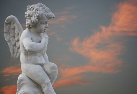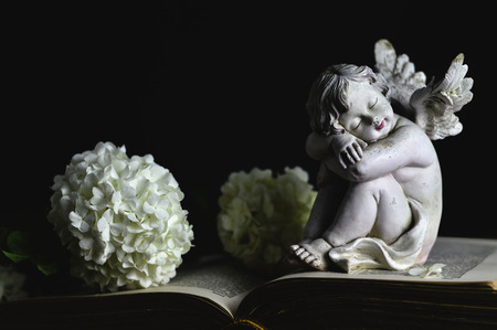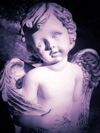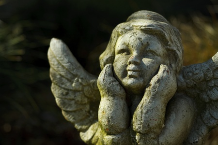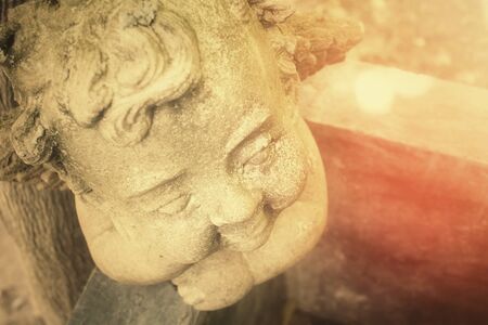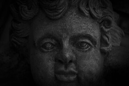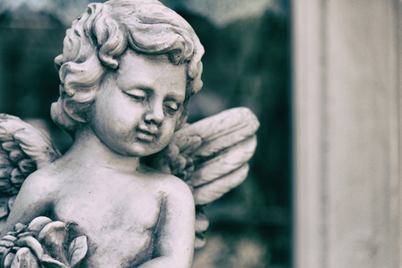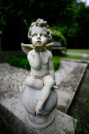 Beautiful little angel statue in garden. Detail and portrait of sitting cupid.