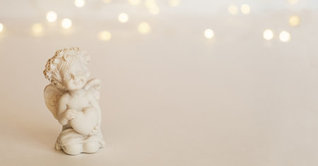 Banner. Cute angel and red rose petals on a white marble background. Theme of love. Valentine's day. Postcard for the holidays.