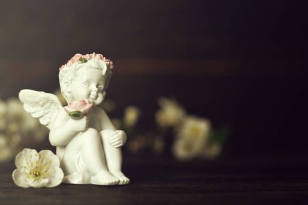 Beauty Cupid statue of Angel in vintage garden on summer. Holding bouquet flowers in his hand