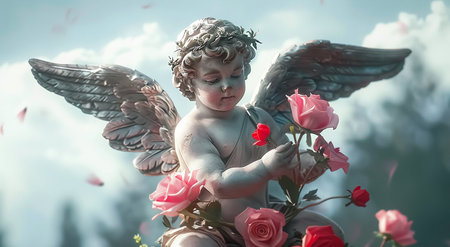 Cherubic figure with wings amidst roses against a dreamy sky, symbolizing innocence and beauty.