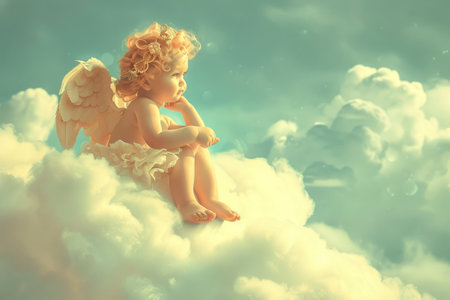 Ethereal Art of Cupid Figure Perched on Clouds Holding a Glowing Arrow, Symbolizing Love and Fantasy. Valentine's Day. Copy space.