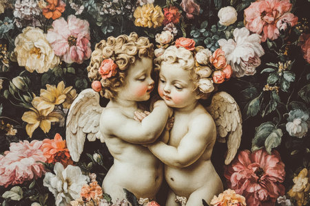 Two cherubic children with curly hair and floral headpieces share a tender moment against a rich floral background, exuding themes of love and purity in a serene setting.