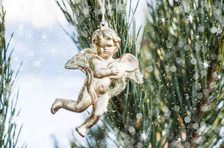 Decorative toy on a Christmas tree with selective focus. Festive background for Christmas.