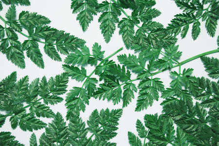 Abstract composition with green leaves on white background. Creative nature layout. Flat lay. Copy space