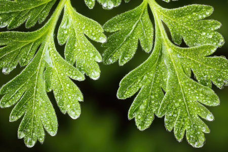 A creative digital illustration depicting Commercial image of herb leaves overlapping in feathery abstract layers, fresh green sheens, layered depth composition, natural soft light. This AI-generated artwork features unique visual elements suitable for various commercial and editorial applications. AI-generated illustration.